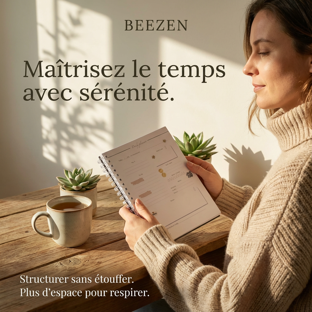 Chez Beezen Lifestyle, nous pensons que la productivité ne doit jamais se faire au détriment de la tranquillité d'esprit. Né du besoin d'équilibrer structure et sérénité, l'Agenda Beezen est plus qu'un simple outil : c'est une philosophie. Notre mission est d'aider chacun à s'approprier son temps avec détermination, à organiser sa vie avec élégance et à vivre chaque jour avec clarté et sérénité.